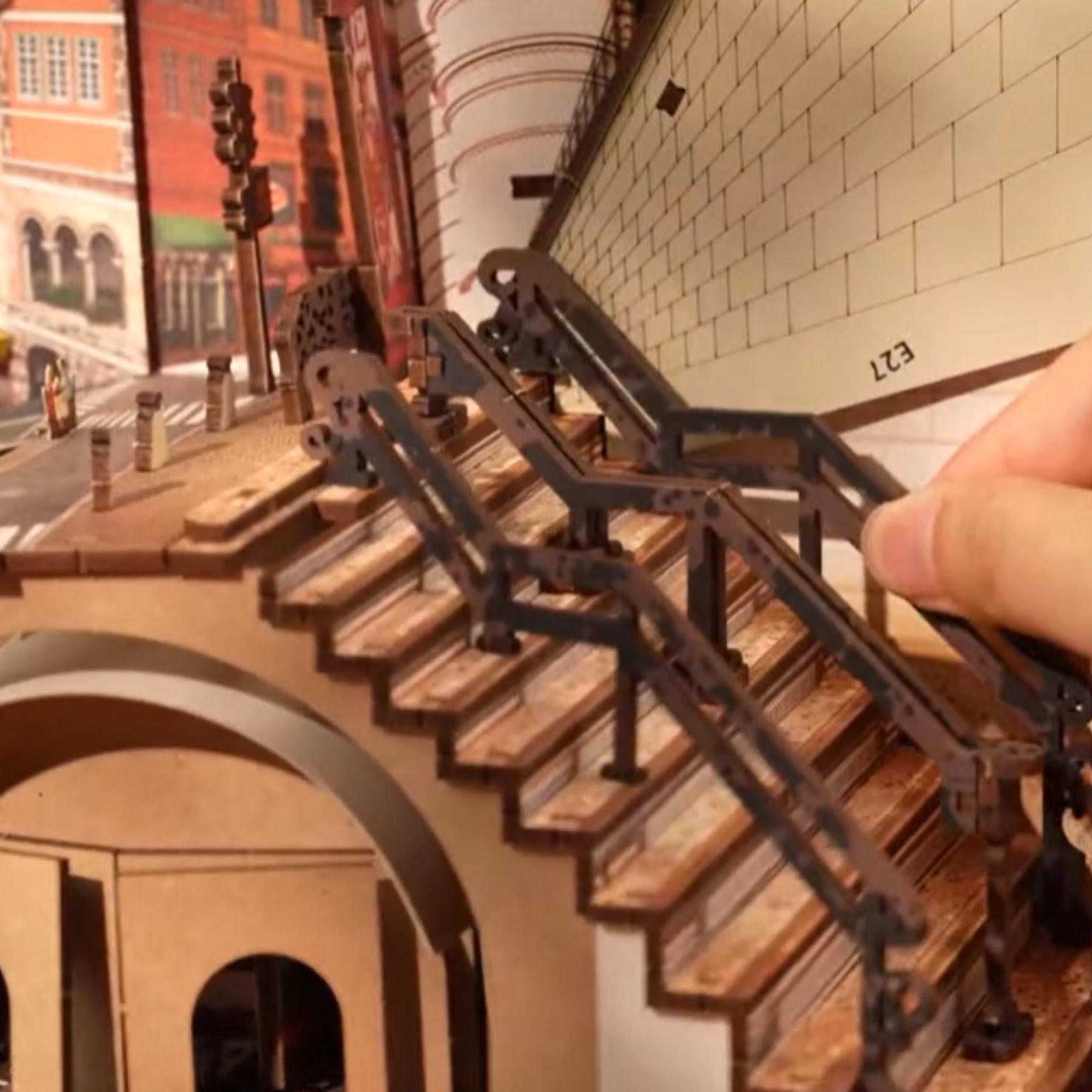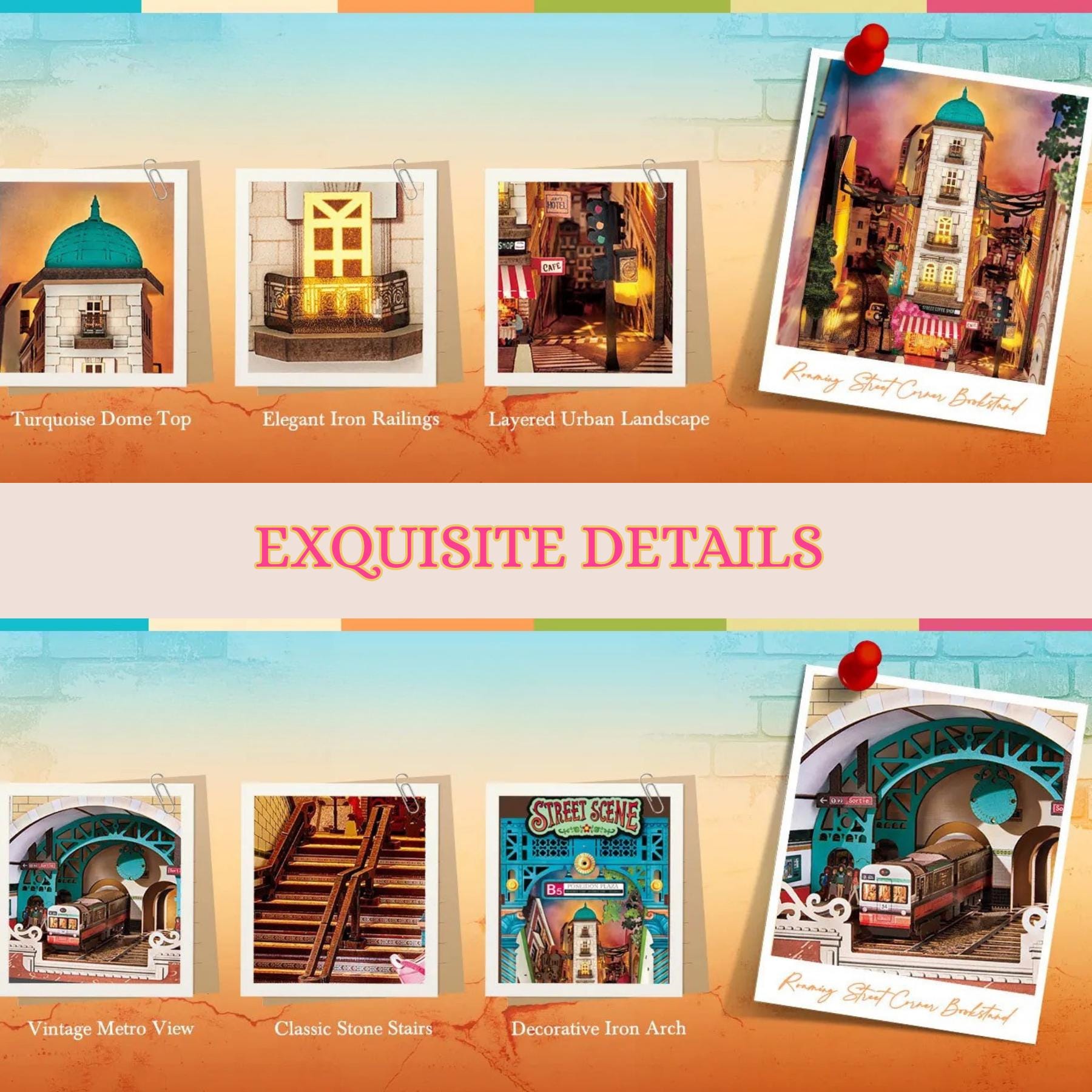 Take a Night Street Stroll every time you glance at your bookshelf. This enchanting book nook transforms the space between your novels into a glowing miniature city scene, complete with textured brick walls, charming street lamps, narrow sidewalks, and warm lighting that captures the magic of an evening walk in the city.